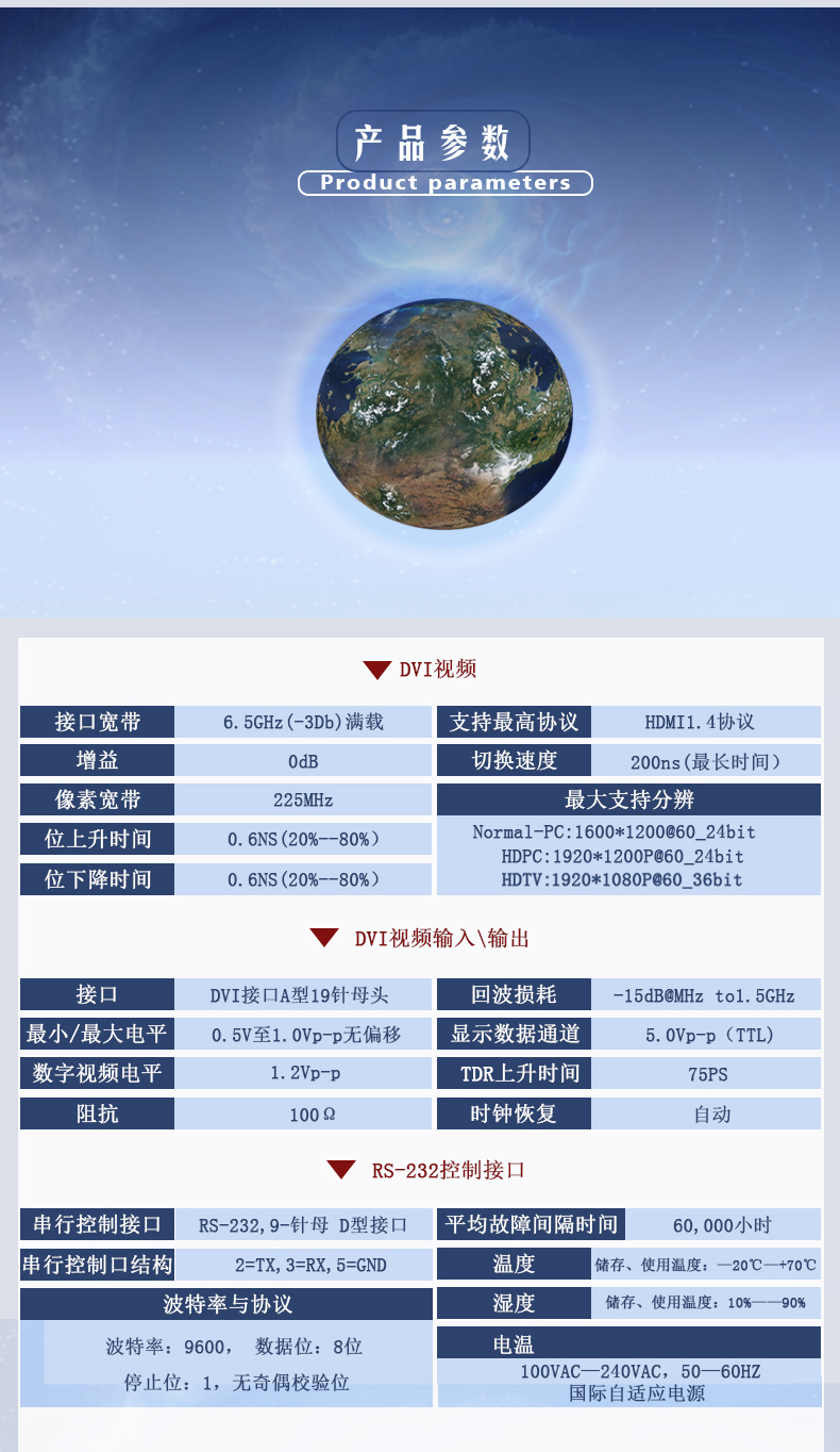 輸入路數:4路,8路,12路,16路,24路,32路,36路,46路,48路,64進;輸出路數:4出,8出,12出,16出,24出,32出,36出,45出,48出,64出,128輸出DVI矩陣切換器