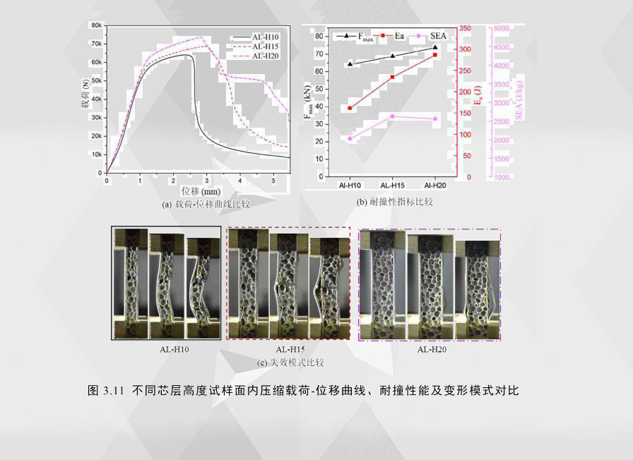 從其耐撞性指標圖3.11(b)中可以看出,鋁合金夾層結構的峰值載荷及總吸能隨芯層高度的增加而增加,而其比吸能的變化趨勢則不然。當夾層結構的芯層高度從10mm增加到15mm,試件在第三階段的主要失效模式由整體屈曲變為面板屈曲,芯層破壞方式也發生了變化,由于后者的失效模式吸收的能量比前者多很多,所以即使結構的重量有所增加,但AL-H15的比吸能(SEA)仍比AL-H10高。而當夾層結構的芯層厚度從15mm增加到20mm時,試件在第二、三階段的主要失效模式基本未發生變化,雖說后者在第三階段的吸能會更多一些,但畢竟總吸能提高的幅度有限,所以AL-H15比AL-H20的比吸能(SEA)更高。