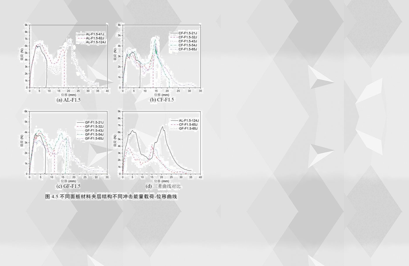 為了分析面板材料對低速沖擊性能的影響,分別對面板為鋁合金、碳纖維和玻璃纖維的夾層結(jié)構(gòu)試件進(jìn)行了不同能量下的沖擊試驗。圖4.5展示了面板厚度為1.5mm的夾層結(jié)構(gòu)在不同沖擊能量下的載荷-位移曲線。三種配置的夾層結(jié)構(gòu)在完全穿透的情況下,鋁合金夾層結(jié)構(gòu)的載荷-位移曲線整體趨勢高于纖維增強加夾層結(jié)構(gòu)。