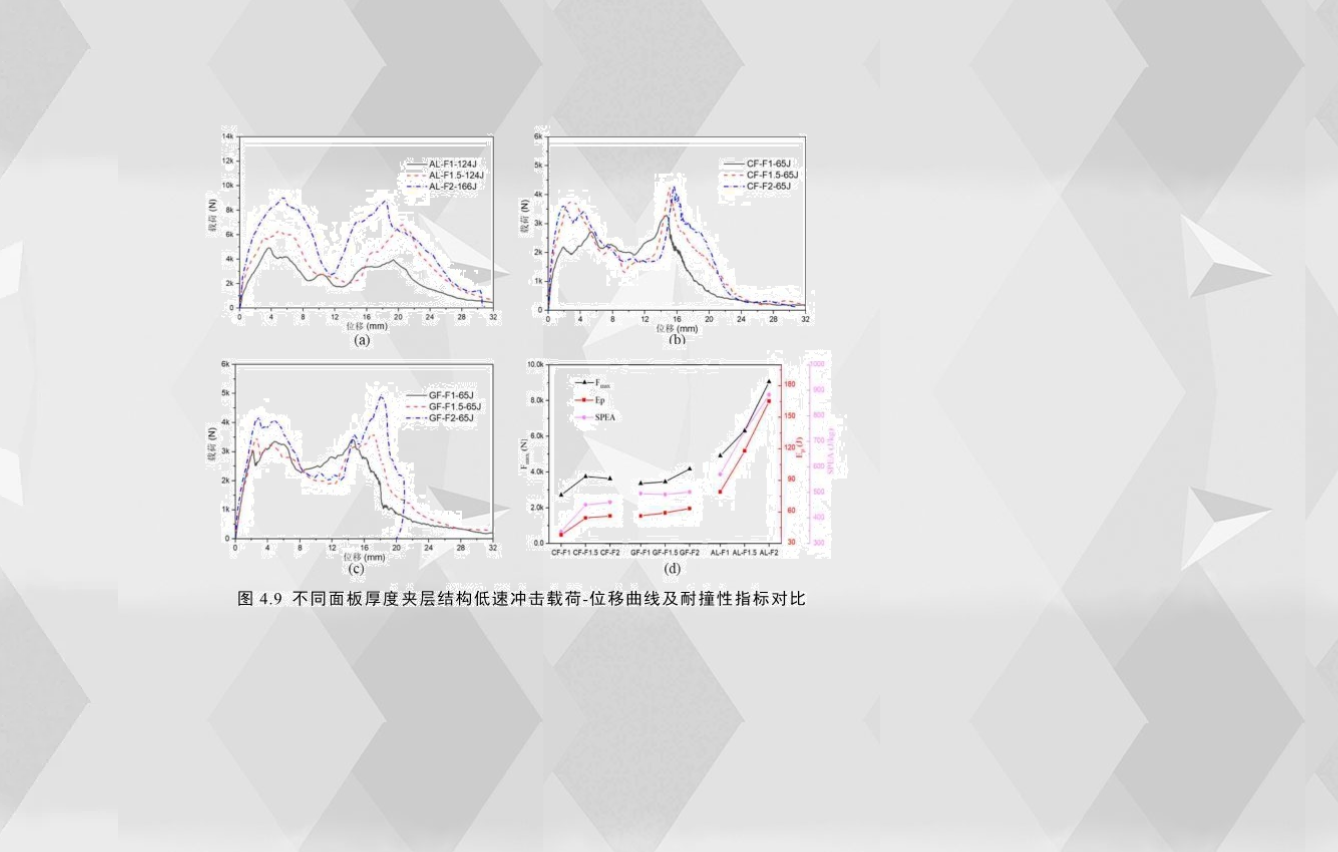 為了研究夾層結構的面板厚度對沖擊性能的影響,圖4.9(a)-(c)比較了三種不同面板厚度的夾層結構的載荷-位移曲線。無論是彈塑性面板還是脆性面板,夾層結構的面板厚度對其低速沖擊響應均有較大影響。為了更直觀地比較,圖4.9(d)對比了不同面板厚度夾層結構的耐撞性指標,通過觀察,鋁合金夾層結構的耐撞性能隨面板厚度增加而明顯增加,面板厚度從1mm增加到2mm其初始峰值載荷、穿透吸能和比穿透吸能分別提高了84%、108%和54%;對玻璃纖維夾層結構而言,當面板厚度從1mm增加到2mm其初始峰值載荷和穿透吸能分別只提高了24%和13%,而面板厚度的增加對比穿透吸能的影響效果差異不大;而對碳纖維夾層結構而言,當面板厚度從1mm增加到2mm,其穿透吸能和比穿透能分別提高了42%和33%,并且隨著層數的增加,耐撞性指標增加的幅度大幅減小。